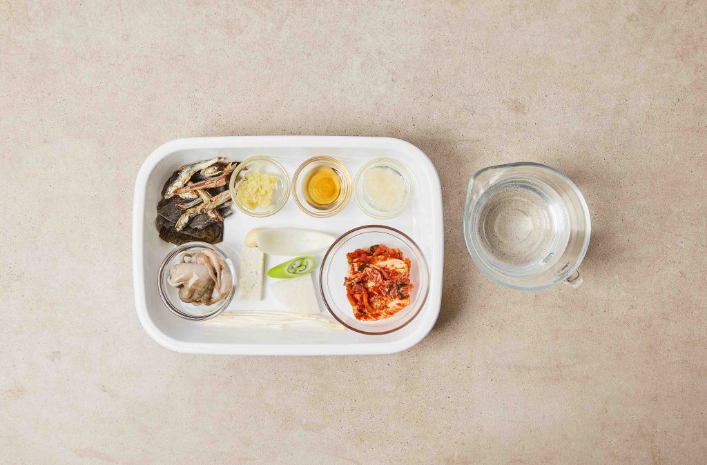 - 김치는 국물을 꽉 짜서 한입 크기로 썰고, 무는 얇게 편 썰고, 마늘은 다지고, 대파는 어슷 썰고, 양파는 굵게 채 썰고, 두부는 납작하게 썰어 준비합니다.